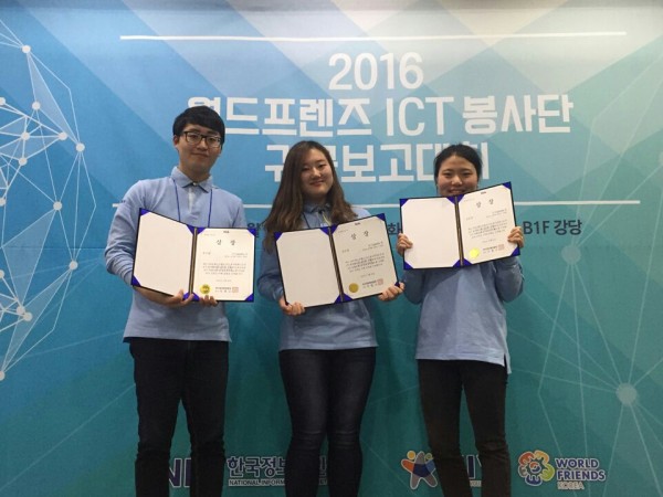 Churlwon Lee, Gyeongbae Song, Zion Jung, and Hyosun Kim, of the School of Computer and Electronical Engineering of Handong Global University received the ‘Grand Prize’ at the ‘2016 World Friends ICT Volunteering Corps Homecoming Brief Competition’ hosted by the National Information Society Agency.