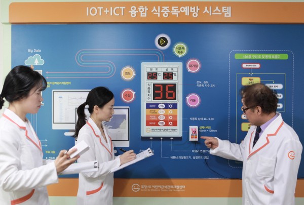 This device is a food poisoning prevention system developed by converging technology between the Internet of Things and Information & Communication technology. In order to prevent food poisoning in small children’s canteen centers with less than 100 kids, the device informs the users of the temperature, humidity, and food poisoning index. This determines the occurrence and multiplication of harmful bacteria. Customized information will be taken by the big data network of the Center. The data will be collected every 30 minutes or at one hour intervals. When the food poisoning index goes up to a dangerous level, a warning alarm will sound and lead to activities to normalize the humidity and temperature. This will create an environment to prevent food poisoning.