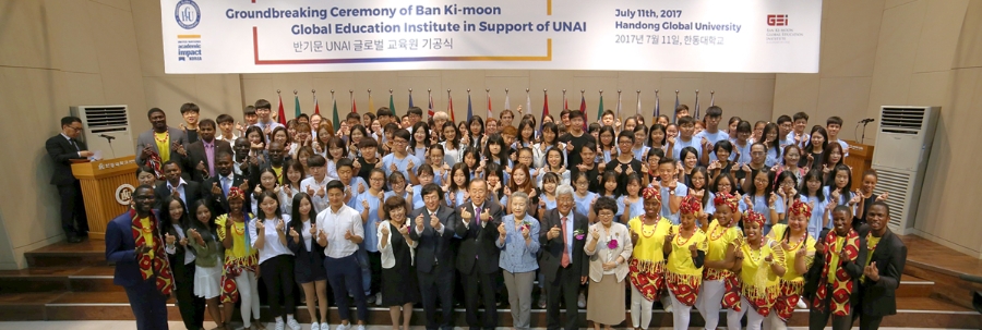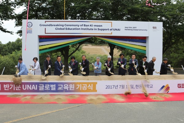The ground-breaking ceremony for the ‘Ban Ki-moon Global Education Institute in Support of UNAI,’ hosted by Handong Global University, President Chang Soon-Heung, and Korea’s Association in Support of United Nations Academic Impact (UNAI Korea), Chairman Young-Gil Kim, was held in in Handong Global University’s All Nations Auditorium on the 11th of July.