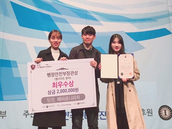 Pepperoni Pizza Team participated in the field of website security and received the grand prize which was The Ministry of Public Administration and Security’s Minister Prize and 2,000,000 KRW. Moon Eui-Geo, Han Bo-Kyeong and Han Sol are students in the School of Computer Science and Electronic Engineering participated in the competition with their Graduation Project topic which was developing a program to detect any security weaknesses on the websites. This led them to achieve excellent result.