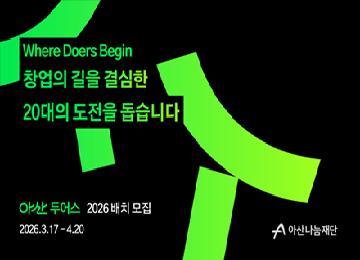 안녕하세요. 아산나눔재단입니다. 20대 예비 창업가의 도전을 돕는 ‘아산 두어스' 2026 배치를 4/20& #40;월& #41;까지 모집합니다.*아산 유니버시티 모집 홈페이...