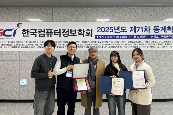 (좌측부터 CX랩장 전정재 학생, 한동대 이한진 교수, 학회장 이원주, 허예은 조교, 홍예은 학생) (사진제공: 한동대)