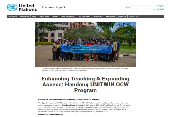UN 아카데믹임팩트는 최근 뉴스레터를 통해 한동대학교가 교육부 지원으로 운영 중인 'Handong UNITWIN Fellowship OpenCourseWare(HUFOCW)' 프로그램이 개발도상국의 교육 격차 해소에 크게 기여하고 있다고 보도했다.