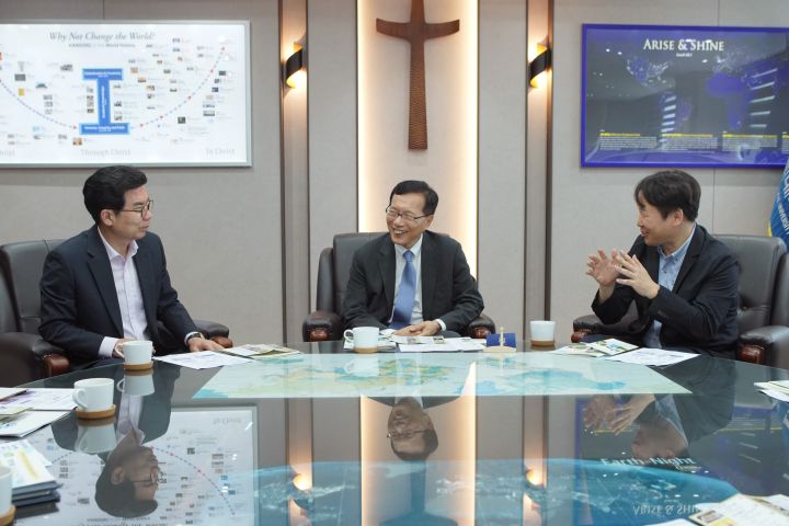 [사진1] 최도성 한동대학교 총장(가운데)이 김광열 영덕군수(좌), 김재효 산학협력단장(우)과 지역혁신 협력방안을 논의하고 있다