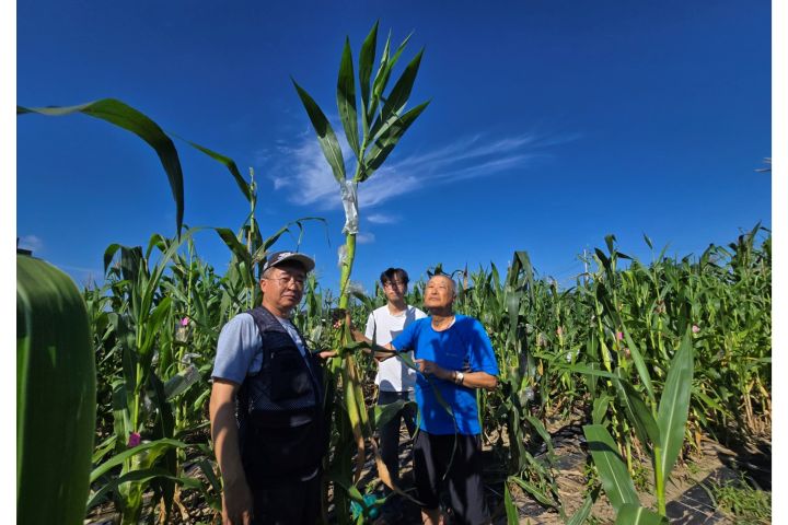 [사진1] 김순권 박사 등이 육종 성공한 청하면 국제옥수수재단 포장의 bm3+Leafy 옥수수 앞에서 포즈를 취하고 있다.