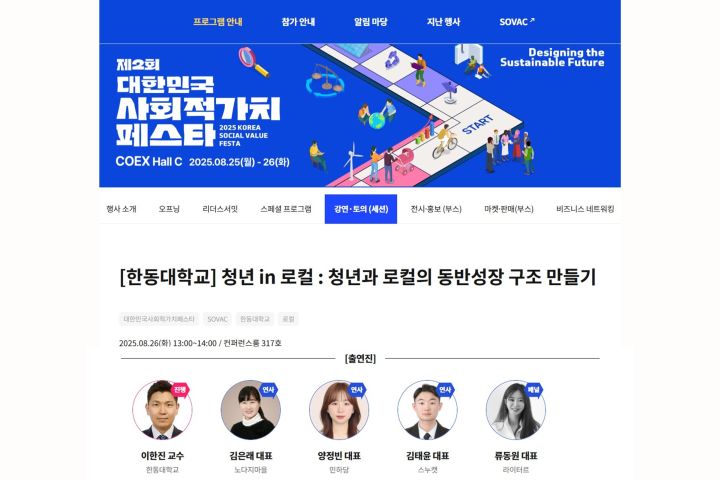 한동대는 지난 25일부터 이틀간 서울 코엑스에서 열린 '제2회 대한민국 사회적 가치 페스타'에서 '청년 in 로컬: 청년과 로컬의 동반성장 구조 만들기' 세션을 성황리에 개최했다고 26일 발표했다.