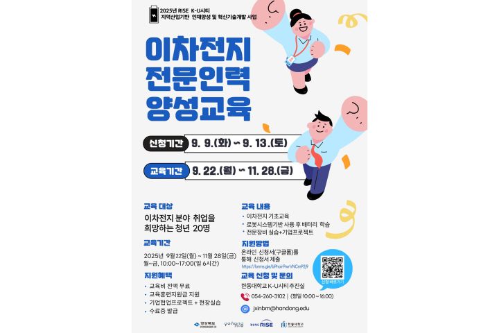 한동대는 경상북도 지역혁신중심 대학지원체계(RISE) K-U시티 인재양성 및 혁신기술개발사업의 일환으로 '전지전능한 이차전지 전문인력양성' 2기 교육생을 모집한다.
