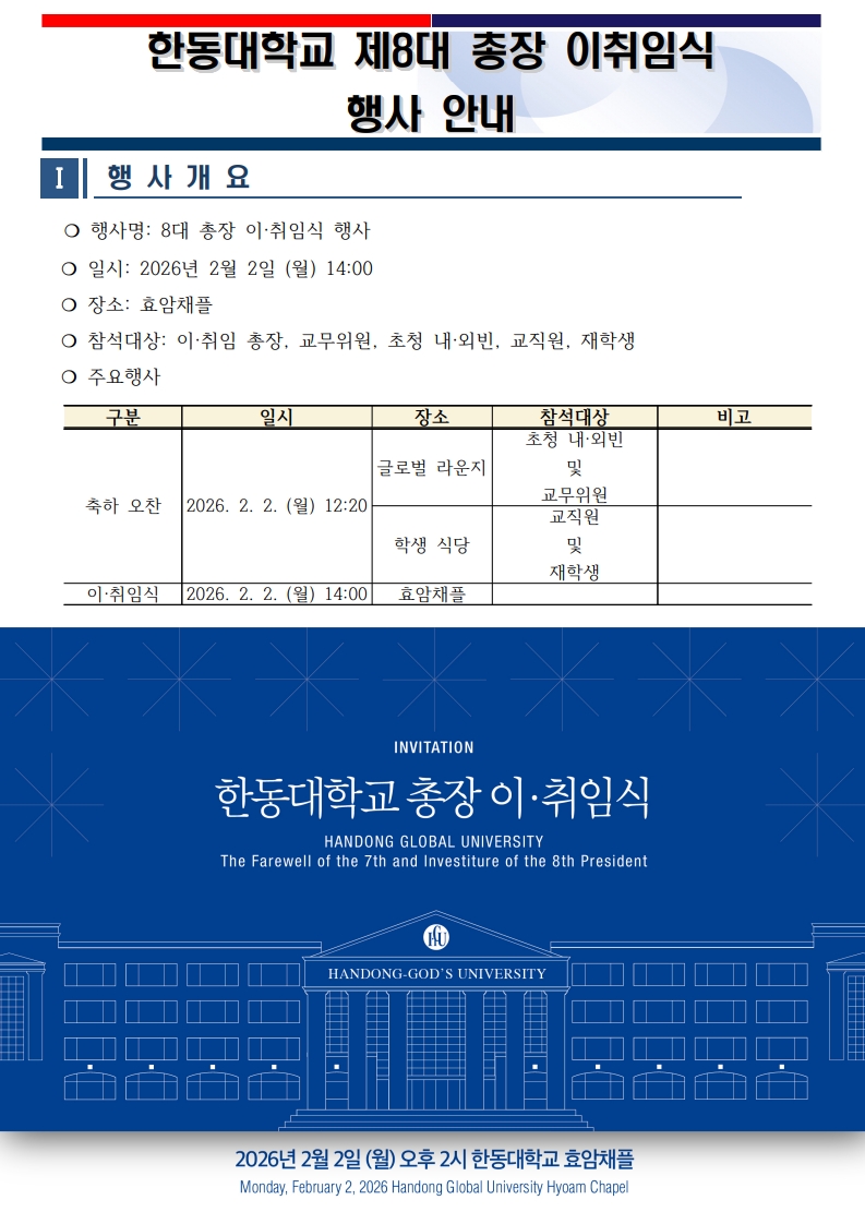 한동대학교 제7대 총장 최도성 박사 이임식 및 제8대 총장 박성진 박사 취임식을 아래와 같이 거행하오니 부디 참석하시어 축하하여 주시기 바랍니다.