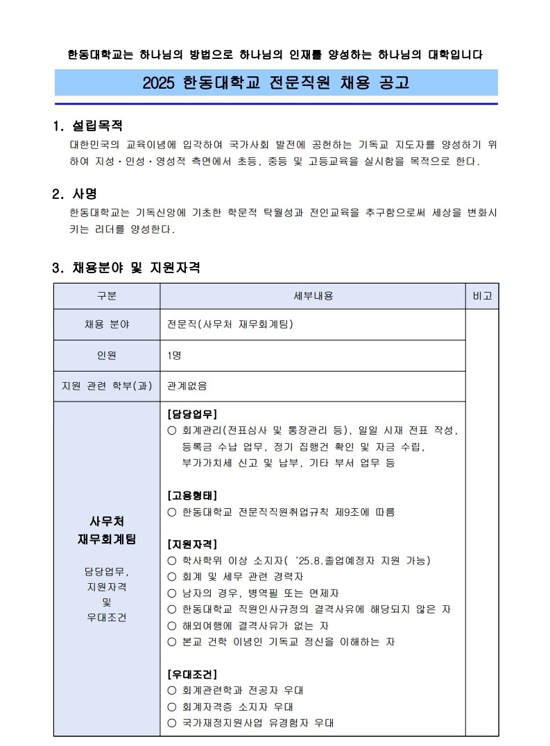 [한동대학교] 2025 한동대학교 전문직원 채용공고