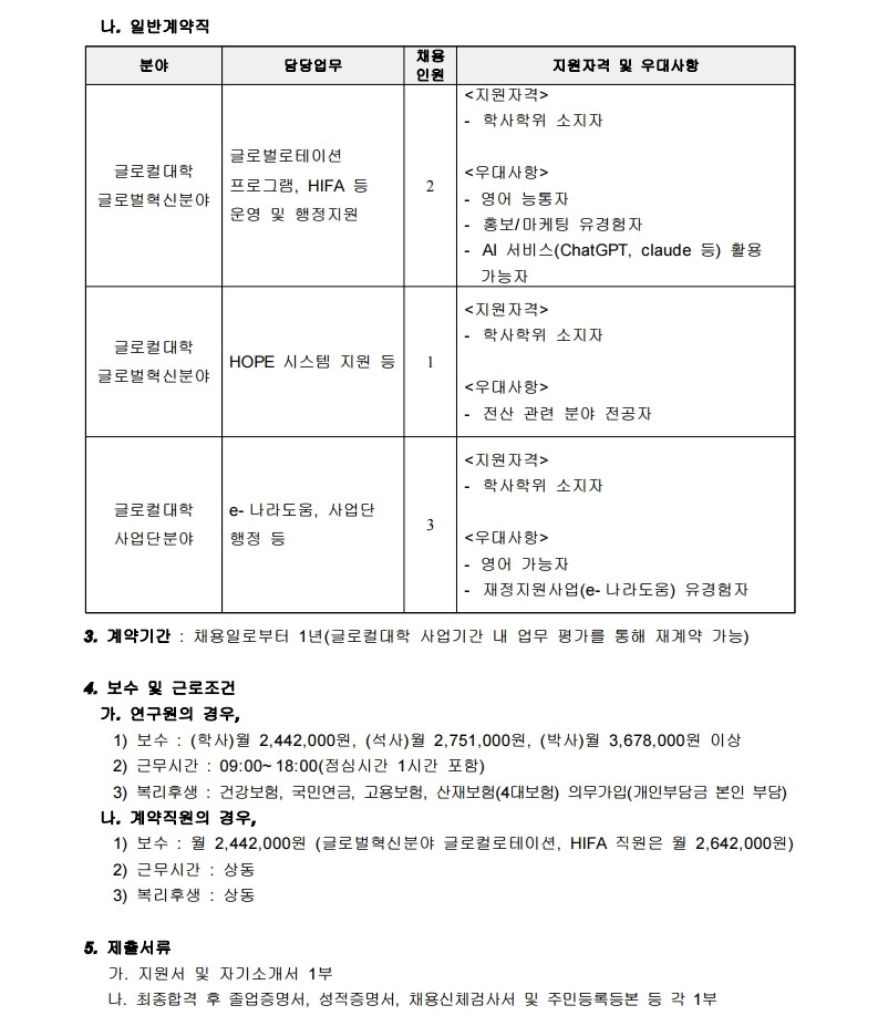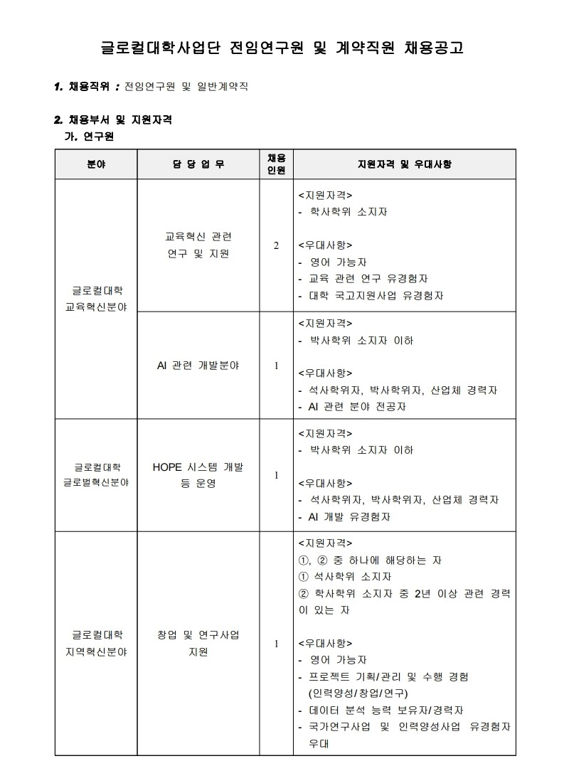 [총무인사팀] 글로컬대학사업단 전임연구원 및 전담직원 채용