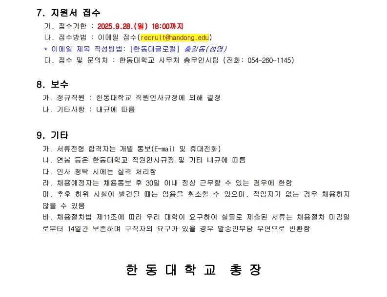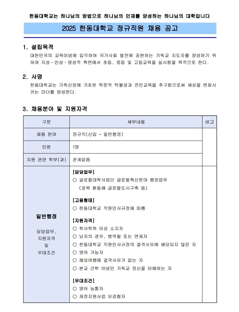 [한동대학교] 2025 한동대학교 정규직원 채용공고