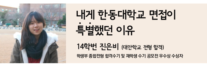 면접고사에서 모든 문제를 완벽하게 대답을 하지 못했기 때문에 떨어질 것 같아 마음이 많이 불안했지만 감사하게 합격 소식을 들을 수 있었습니다. 면접을 보기까지 많은 사람들과 선배들에게 받은 도움들을 잊을 수 없습니다. 선배, 교수님과의 이런 친밀하고 깊은 관계는 한동대학교의 고유하고 특별한 장점입니다. 이제 2015년에는 한동의 선배로서 내가 받은 감동을 후배들도 그대로 느낄 수 있도록, 한동만이 가지고 있는 귀하고 소중한 문화가 이어지도록 노력할 것입니다.