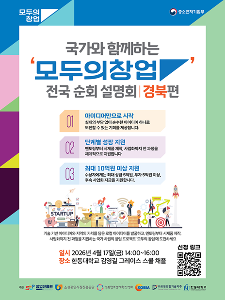 아울러 2026년 4월 17일(금) 한동대학교 그레이스채플에서 「모두의 창업 프로젝트」 경북권 지역설명회가 진행될 예정이며, 사업에 대한 보다 자세한 설명과 관계자 안내가 이루어질 예정이오니 많은 관심과 참여를 부탁드립니다.
