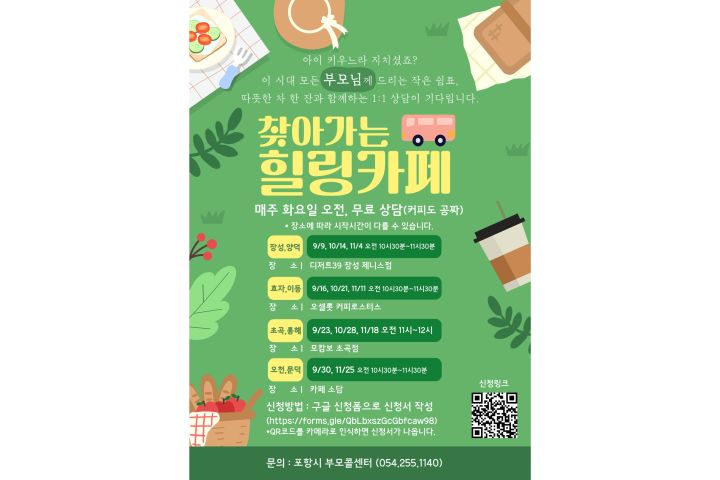 지난 9월부터 시작된 이 프로그램은 기존 상담실이 아닌 일상 속 카페 공간에서 부모들이 편안하게 심리상담을 받을 수 있도록 기획된 현장형 상담 서비스다. 장성동·효자동·초곡동·오천읍 등 네 곳의 카페를 순회하며 매주 화요일 1시간씩 무료 1:1 심리상담을 제공하고 있다.