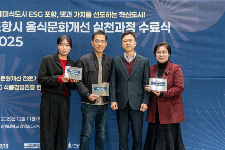 한동대학교(총장 최도성)가 포항시, UN아카데믹임팩트 한국협의회(UNAI Korea)와 함께 지난 11일 '세계시민도시 ESG 포항, 음식문화개선 전문가 양성 과정' 수료식을 성황리에 개최했다. 2023년부터 3년째 이어온 이번 과정은 단순 교육을 넘어 포항 외식문화의 지속가능한 새로운 기준을 제시하며 지역 혁신의 실질적 모델로 주목받고 있다.