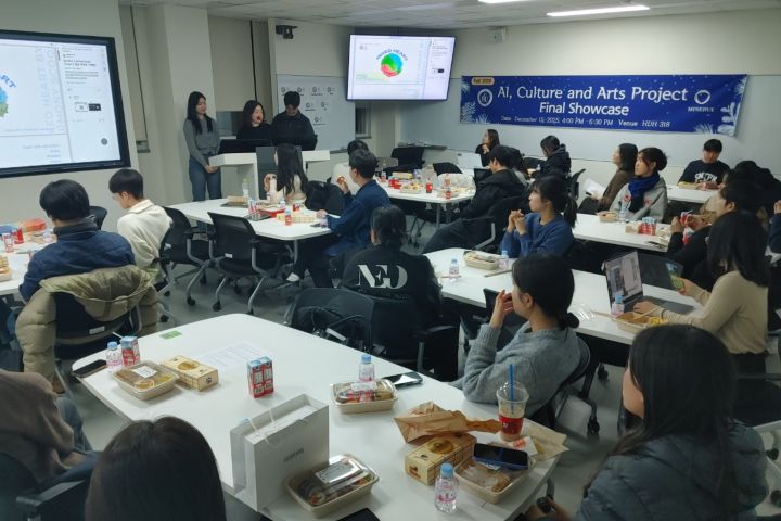 [사진1] 한동대 'AI 문화예술 프로젝트' 쇼케이스에서 학생들이 AI 기반 창작 결과물을 발표하고 있다