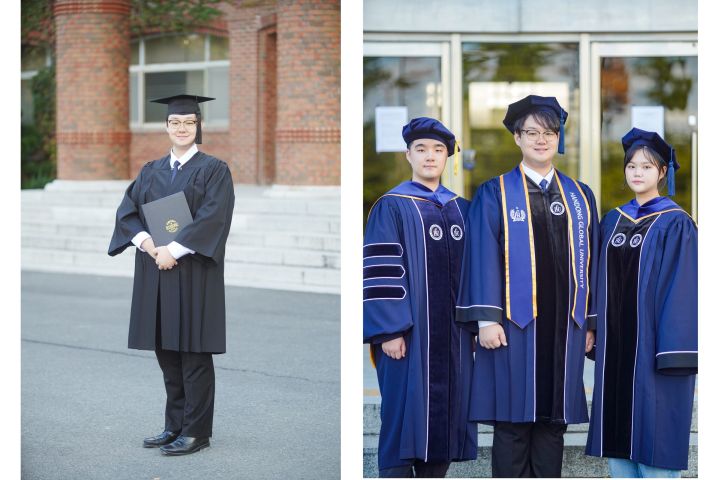 [사진1] 개교 30주년 기념 한동대학교 신규 학위복. 기존 학위복(왼쪽)에서 청색 기반의 디자인으로 전면 개편됐다. 오른쪽 사진 좌측부터 박사·학사·석사 학위복