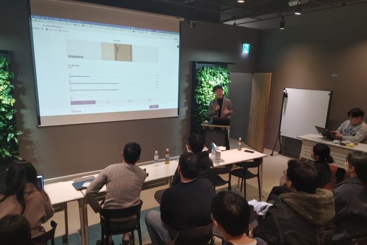 [사진1] 한동대, MYSC, KSH 관계자들이 경북 청년창업 3곳의 인큐베이팅 쇼케이스 발표를 듣고 질의응답을 나누고 있다.