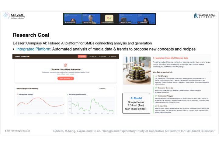 한동대 연구팀(심다영·강민영·원유미 학생, 지도교수 이한진)은 'Design and Exploratory Study of Generative AI Platform for F&B Small Business(외식업 소상공인을 위한 생성형 AI 플랫폼 설계 및 탐색 연구)'를 주제로 6개월간의 연구 성과를 발표했다. 이 연구는 구글 AI 스튜디오와 생성형 AI 기술을 활용해 디지털 전환에 어려움을 겪는 지역 외식업 소상공인들이 현장에서 바로 활용할 수 있는 실용적 플랫폼을 제안했다는 점에서 심사위원단의 높은 평가를 받았다.