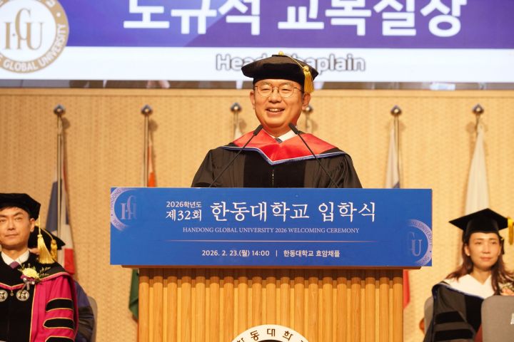 한동대학교(총장 박성진)가 제32회 입학식을 개최하고 2026학년도 신입생 811명의 새로운 출발을 축복했다. 이날 입학식은 교수진, 신입생, 학부모 등 다수가 참석한 가운데 김군오 입학처장의 개회 선언을 시작으로 총장 환영사, 학사부총장 기도, 교목실장 말씀, 신입생 선서, 축복송 순으로 진행됐다.