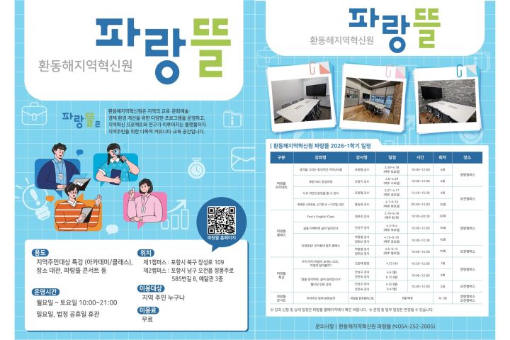 파랑뜰은 대학의 교육 자원과 지역사회의 수요를 연결하는 ‘학교 밖 캠퍼스’이자 개방형 플랫폼으로, 시민 누구나 무료로 참여할 수 있다. 이번 학기에는 환동해지역혁신원 제1캠퍼스(장량캠퍼스)와 제2캠퍼스(오천캠퍼스) 두 곳에서 파랑뜰 아카데미·클래스·특강·콘서트 등으로 구성된 프로그램이 운영된다.
