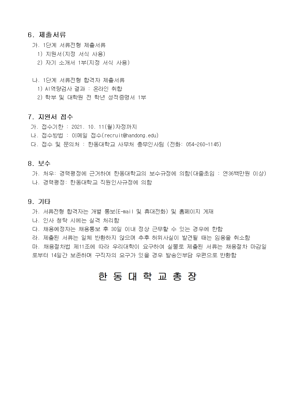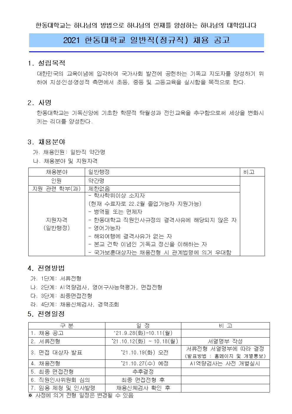 2021 한동대학교 일반직(정규직) 채용 공고