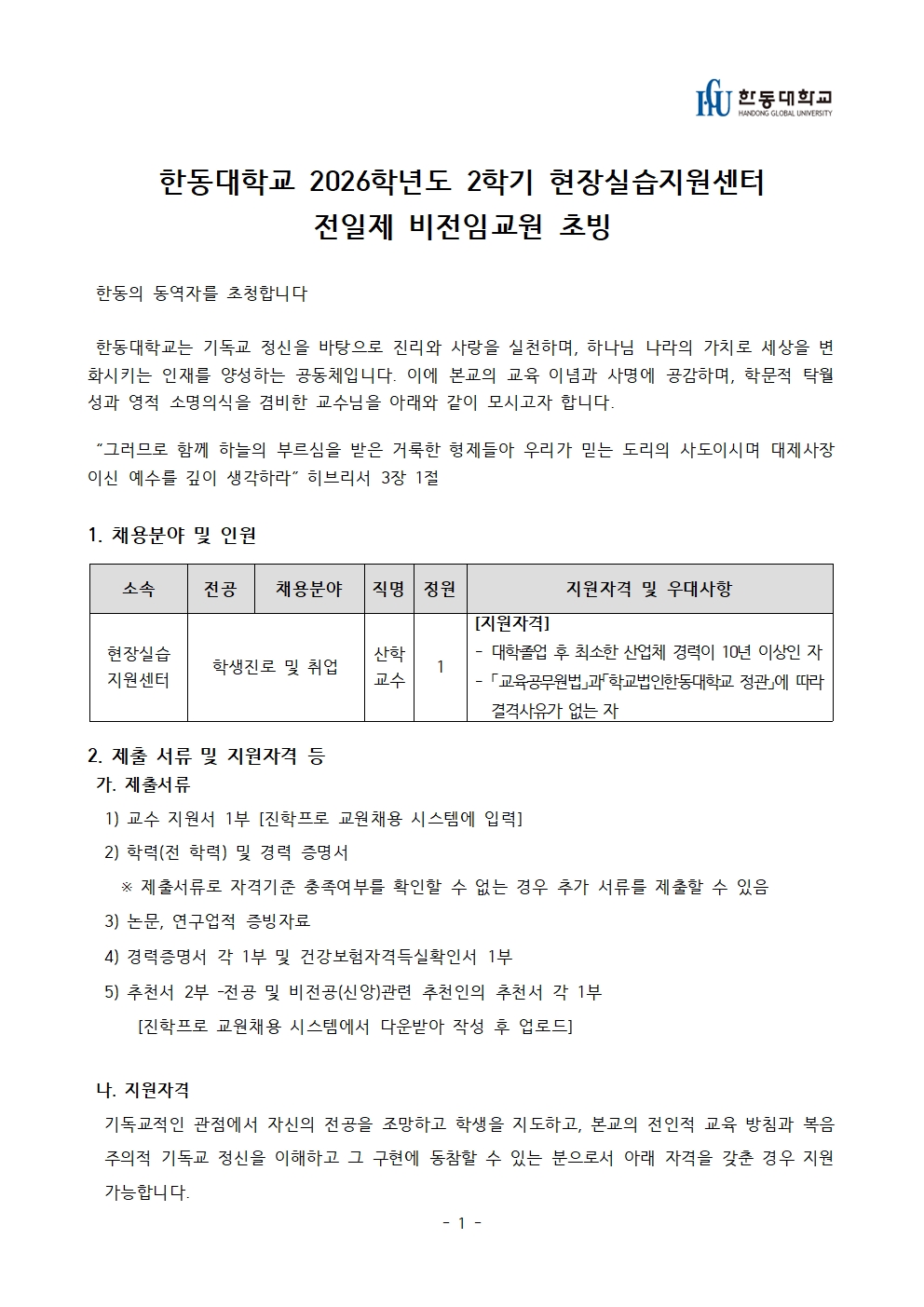 [교무팀] 2026학년도 2학기 교목실 전일제 비전임교원 초빙